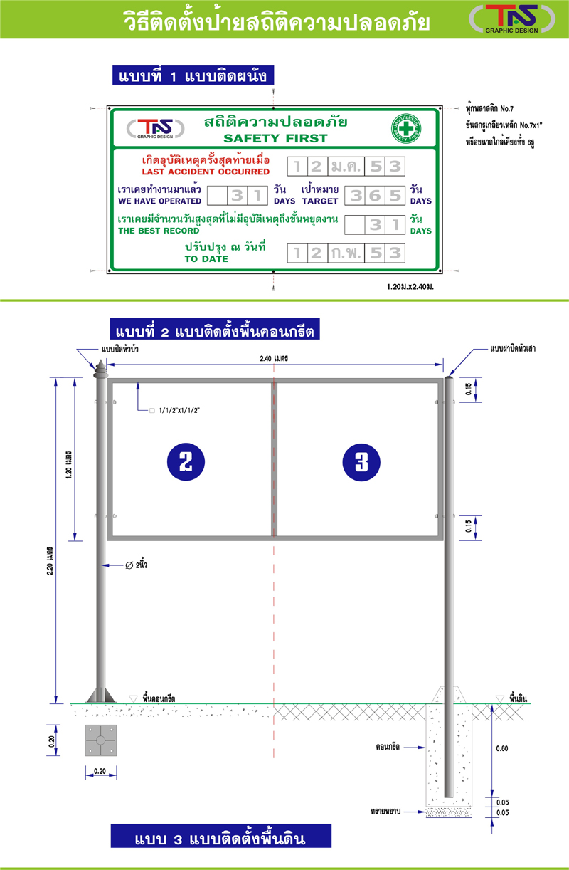 ป้ายสถิติความปลอดภัย มีแบบมาตราฐาน 3 รูปแบบ ขนาดป้าย 90 x 180 ซม.และ 120 x 240ซม.